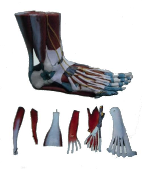 本模型适用于普通中学和医学院讲解生理卫生和生理解剖基础课程应用的直观教具,使学生了解人体足部肌肉、骨骼、关节、肌腱、韧带、神经动脉和静脉等结构,该模型显示了足部与小腿低位的各个解剖细节结构,可拆卸成7个组件分别进行观摩。